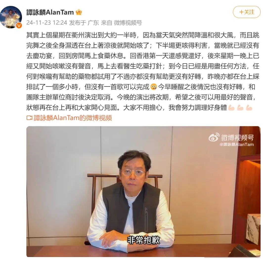 11月23日,谭咏麟在广东惠州举办的经典传奇巡回演唱会因其身体原因延期。当天11时,主办方广州华星演艺有限公司发布延期公告及补偿方式,称本次演唱会取消,并延期至2025年4月,并说明保留订单、退票、补偿方案等事项。谭咏麟在回应视频中称,演唱会可能延迟至明年4月19日。