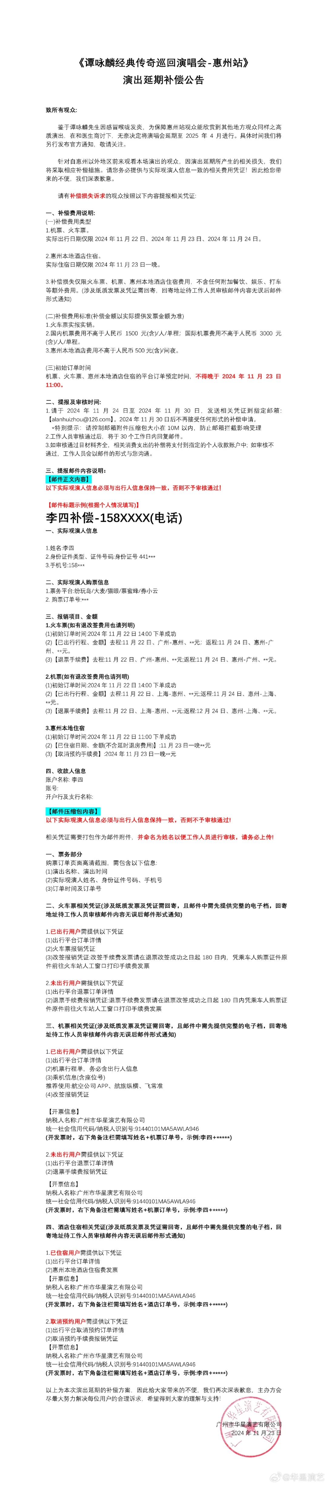 23日深夜,广州市华星演艺有限公司发布了“延期补偿公告”。据公告,所有已购买演唱会门票的观众,可以保留本次订单至延期场次,无需任何操作,原票原座位有效;或在2024年11月24日00:00-2024年11月30日23:59通过原购票平台(纷玩岛、大麦网、猫眼、票蜜蜂、券小云)申请全额退款。